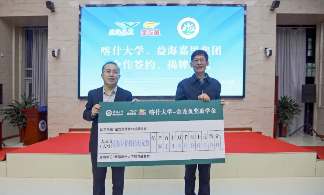 12月12日,我校与金龙鱼慈善公益基金会隆重举行“金龙鱼奖助学金”捐赠签约仪式。金龙鱼慈善公益基金会向喀什大学捐赠144万元,助力我校学子追梦求学,为高等教育事业的繁荣发展贡献力量。